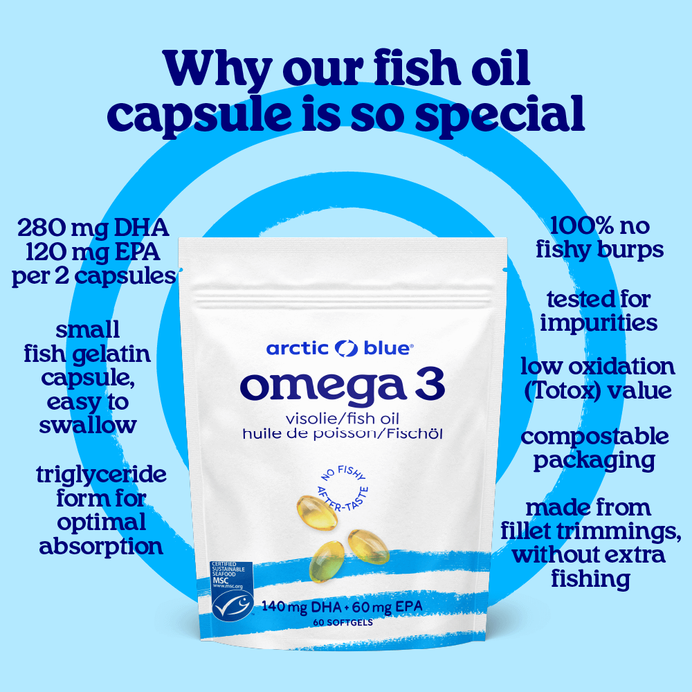 Onze visolie wordt gemaakt (van de filet-snijresten) van verse Arctische wilde kabeljauw die zwemt in de Barentszzee, dit ligt tussen Nova Zembla, Spitsbergen en Noord-Noorwegen.