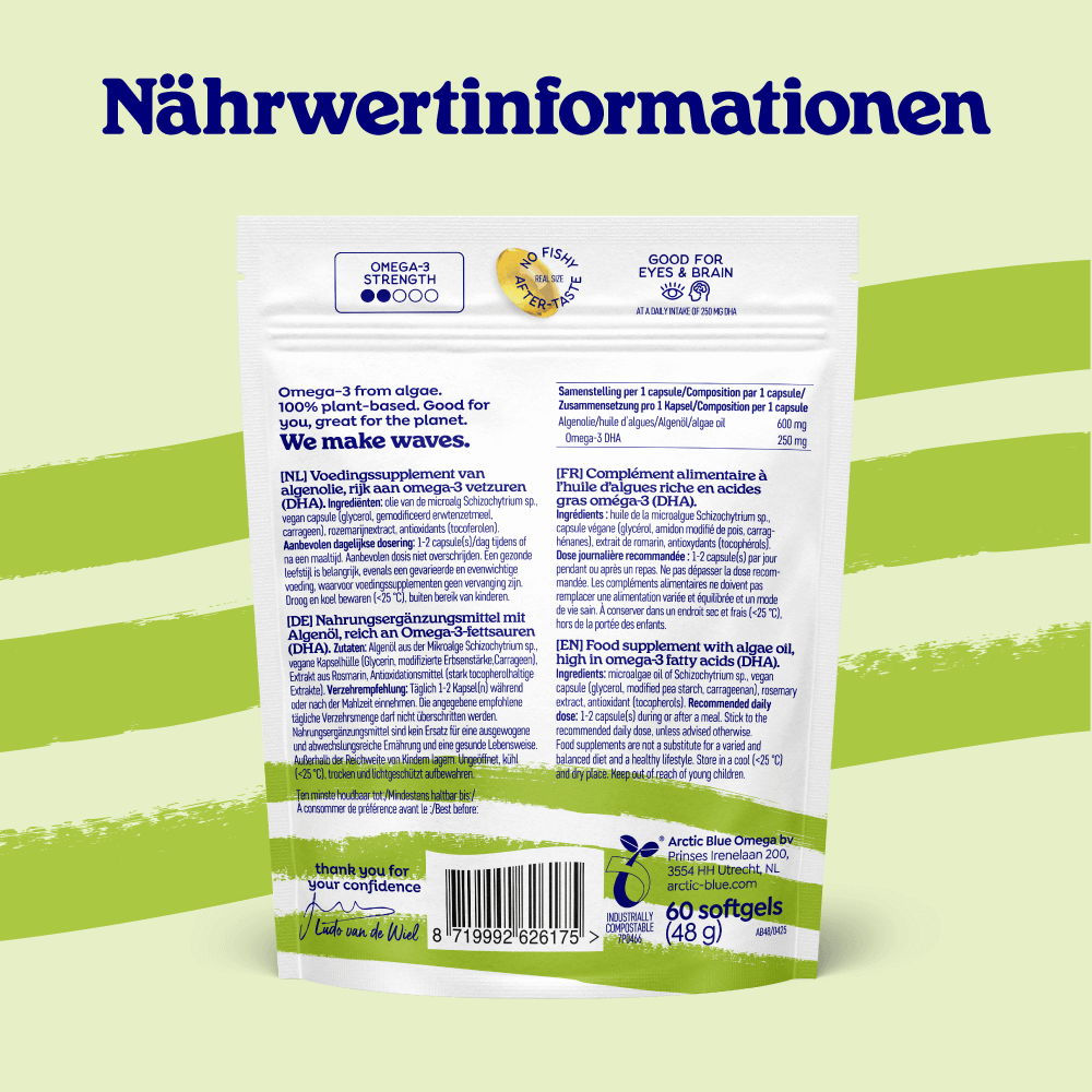 Schizochytrium sp. Algenöl, Glycerin, modifizierte Stärke, Carrageen (Algenextrakt), Sonnenblumenöl mit hohem Ölsäuregehalt, Dinatriumphosphat, Wasser, natürlicher Rosmarinextrakt, Antioxidationsmittel (Tocopherole, Ascorbylpalmitat).