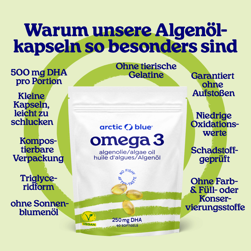 Nehmen Sie die Algenölkapseln nicht auf nüchternen Magen, sondern kurz vor oder kurz nach einer Mahlzeit ein.