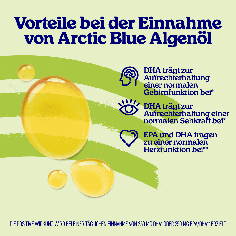 Es ist wissenschaftlich erwiesen, dass diese Menge an EPA und DHA gut für das Herz**, gut für die Sehkraft* (hilft, scharf zu bleiben) und gut für die Gehirnfunktion* ist. Die positive Wirkung wird bei einer täglichen Einnahme von 250 mg DHA* oder 250 mg EPA/DHA** erzielt.