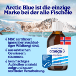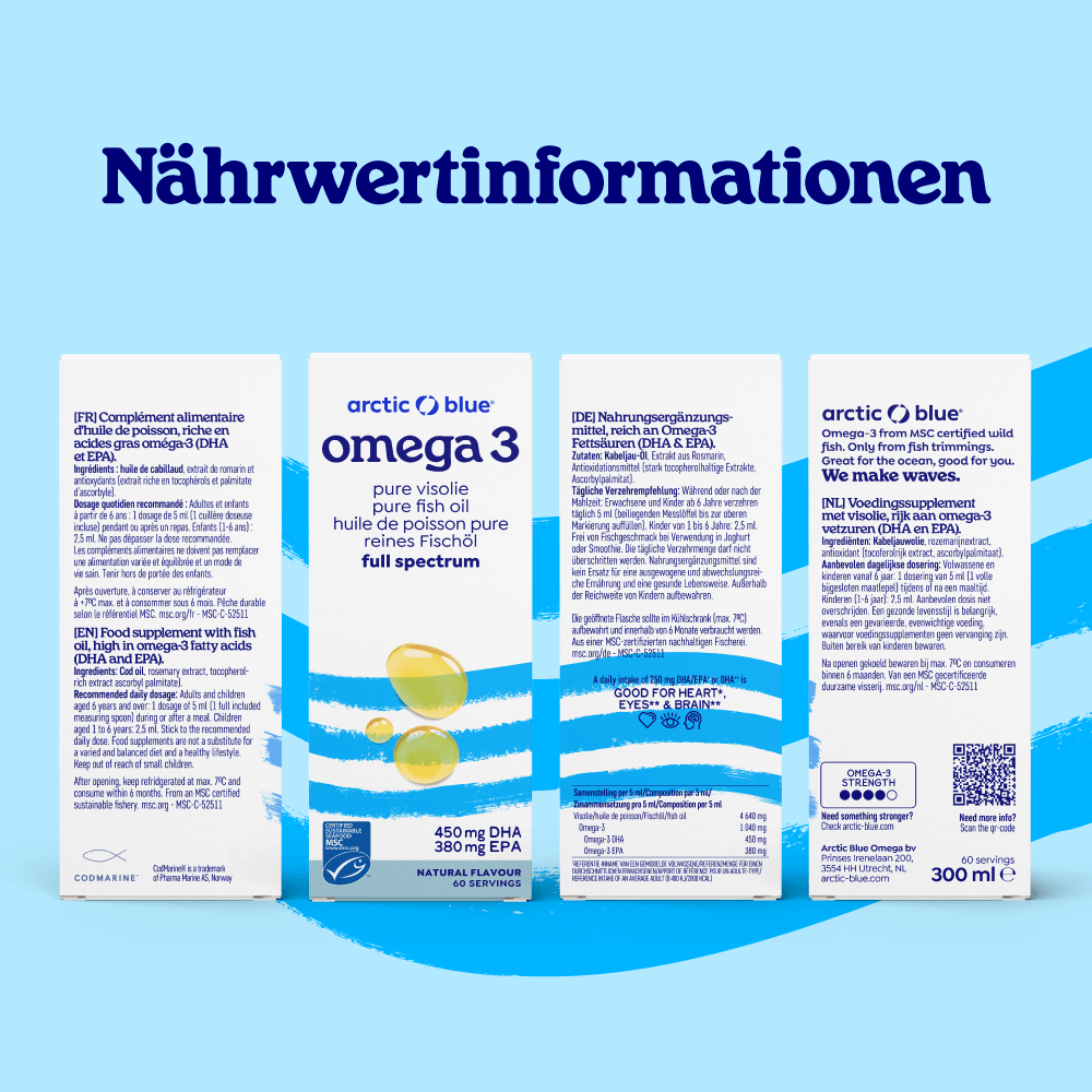 Wilde fette Fische wie Hering, Sardinen oder Makrele sind eine sehr gute Quelle für die wertvollen ungesättigten Fettsäuren Omega-3 EPA und DHA. Im Gegensatz dazu enthält magerer Fisch (Kroketten, Fischstäbchen, Tilapia und Pangasius) kaum diese wichtigen Nährstoffe. Pure Arctic MSC Fish Oil ist für alle da, die sich mit fettem Fisch schwer tun. Die tägliche Dosis (5 ml) (ein Dessert oder Teelöffel) von Pure Arctic Fish Oil enthält die Omega-3-Fette von (umgerechnet) mehr als einem halben Hering. Es ist wissenschaftlich erwiesen, dass diese Menge an EPA und DHA gut für das Herz**, gut für die Sehkraft* (hilft, scharf zu bleiben) und gut für die Gehirnfunktion* ist. Die positive Wirkung wird bei einer täglichen Aufnahme von 250 mg DHA* oder 250 mg EPA/DHA** erzielt. Dies sind gesetzlich anerkannte gesundheitsbezogene Angaben. Bis zu 20 % des Fettes in unserem Gehirn besteht aus Omega-3-DHA; es ist ein wichtiger Baustein für das Gehirn (wie Kalzium für die Knochen). Die positive Wirkung von EPA und DHA auf den Blutdruck* und die Triglyceridwerte** (Blutfette) ist ebenfalls wissenschaftlich erwiesen. Die positive Wirkung wird bei einer täglichen Einnahme von 3000* mg und 2000** mg EPA/DHA erzielt.