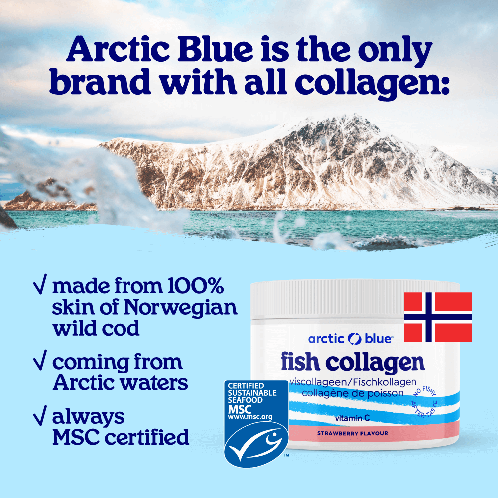 Collagen hydrolysate means that Fish collagen has been cut (hydrolyzed) into smaller pieces of protein called peptides. Every collagen supplement (powder or capsules) is a hydrolysate. In our bodies, we further cut the peptides into individual amino acids that are absorbed into the blood. The reason Arctic Blue chooses Fish collagen is that it is most similar to human collagen, which is explained here. In addition, Arctic Blue is the only brand with a seal of approval for the collagen powder, which proves that it comes from wild fish (and not from e.g. farmed tilapia or cows).