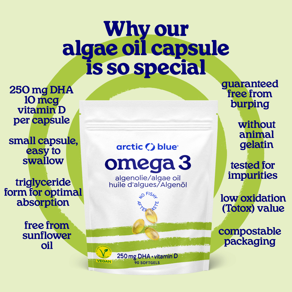 One vegan capsule of algae oil contains 250 mg of Omega-3 DHA. It has been scientifically proven that daily intake of this amount of DHA is good for vision (helps maintain sharp vision) and beneficial for brain function. The beneficial effect is obtained with a daily intake of 250 mg of DHA. These are legally approved health claims. As much as 20% of the fat in our brains consists of Omega-3 DHA; it is an important building block for brains (as calcium is for bones). The plant-based vitamin D3 in this algae oil capsule is important for maintaining strong bones and strong teeth. Vitamin D3 also helps ensure a good resistance and plays a role in maintaining strong muscles. An increasing number of people get little sun for a good part of the year to produce the necessary vitamin D. These are people who spend a lot of time indoors (the elderly, people in offices, children who play a lot of games, people wearing covering clothes or people on night shifts). People who do not consume animal products get very little vitamin D through their diet. This is the reason we chose 20 mcg of vitamin D3 per capsule. The Voedingscentrum has made this overview of what different target groups need daily extra vitamin D.