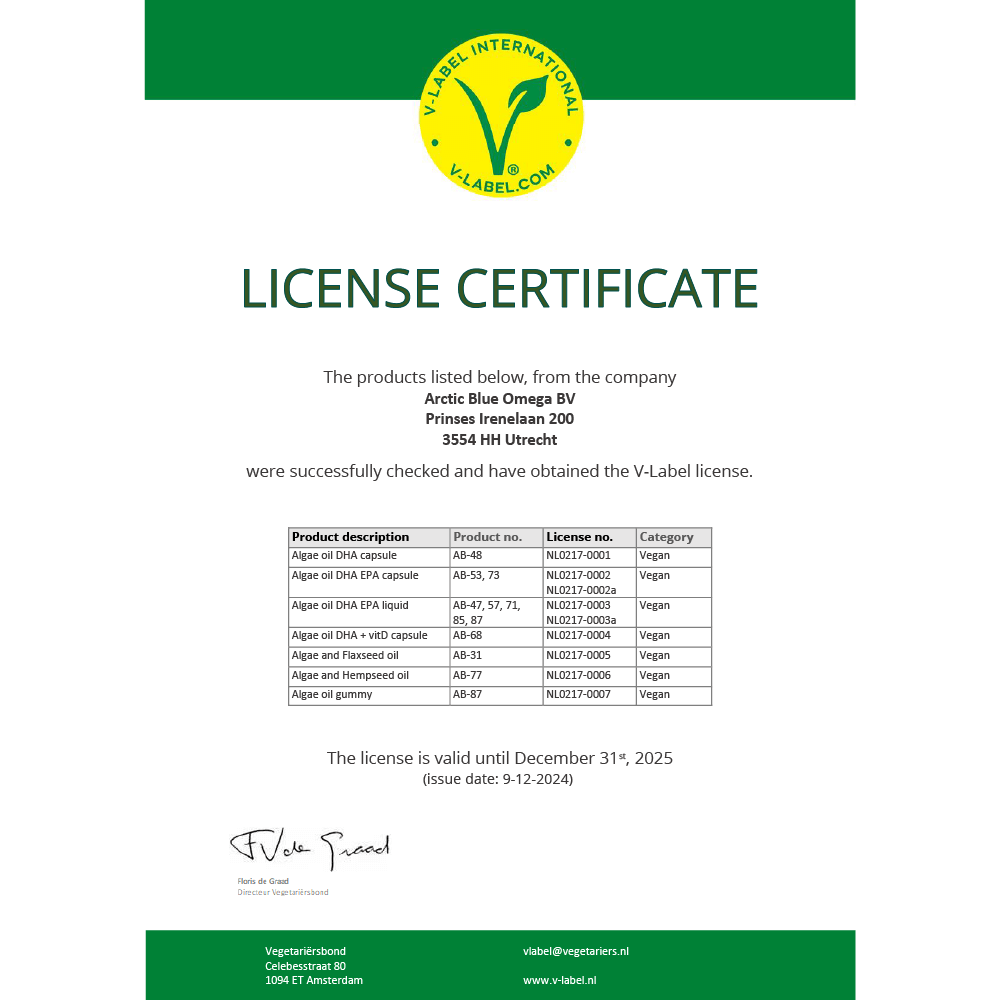 Schizochytrium sp. Algenolie, glycerol, gemodificeerd zetmeel, carrageen, hoog oliezuur zonnebloemolie, plantaardige vitamine D3 (cholecalciferol), natuurlijk rozemarijn extract, antioxidant (natuurlijke tocoferolen, ascorbylpalmitaat), zuurteregelaar (dinatriumfosfaat). Plantaardige algenolie wordt gemaakt van gekweekte microalgen in een gesloten systeem zonder milieu invloeden van buitenaf. Zo’n fermentatieproces lijkt op hoe yoghurt (m.b.v. bacteriën) en bier (m.b.v. gisten) in een fermentor wordt gemaakt De olie wordt uit de algenmassa geperst en er wordt natuurlijk antioxidant toegevoegd om de gevoelige Omega-3 vetzuren te beschermen. Een kleine beetje zonnebloemolie dient om de hoeveelheid Omega-3 DHA constant te houden. De plantaardige vitamine D3 wordt aan de algenolie toegevoegd voordat de capsules worden gemaakt met behulp van zeewier extract (carrageen). Het vitamine E houdende natuurlijke antioxidant beschermt de gevoelige Omega-3 vetzuren. Plantaardige tocoferolen (o.a. alfatocoferol) is vitamine E en beschermt als antioxidant de gevoelige Omega-3 vetzuren. <1 mg per capsule. Ascorbylpalmitaat is de vetoplosbare vorm van vitamine C en beschermt (net als rozemarijn extract) als antioxidant ook de gevoelige Omega-3 vetzuren. < 1 mg per capsule. Schizochytrium sp. is de naam van de algensoort. We zijn wettelijk verplicht deze te vermelden. Glycerol is een verdikkingsmiddel die samen met zetmeel (zie veelgestelde vragen) en carrageen het capsuleomhulsel vormt. Tezamen 25% van de hele capsule. Dinatriumfosfaat is in voeding een standaard zuurteregelaar die in minuscule hoeveelheid (<3 mg) mede zorgt voor stevigheid van de capsule. De capsule is vrij van kunstmatige aroma’s en vrij van conserveringsmiddelen, kleur- of zoetstoffen.