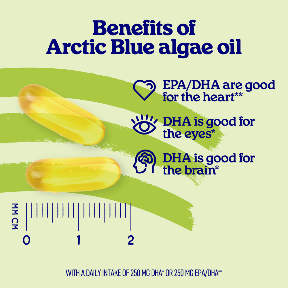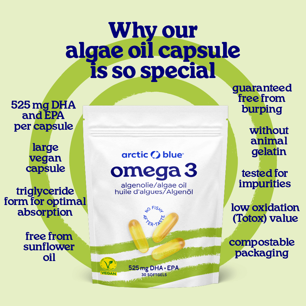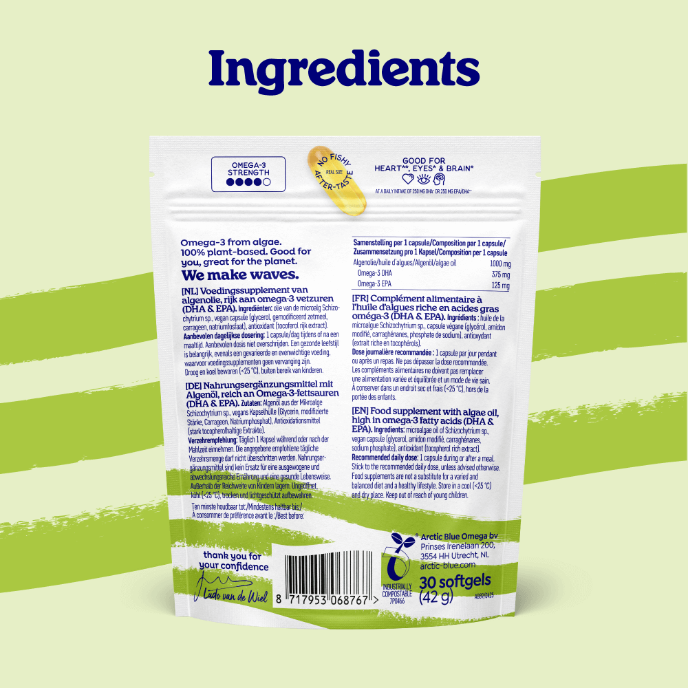 Algae are mini-plants that can make their own Omega-3 fatty acids in water. In nature, algae pass these on to "fatty" fish such as herring and sardine when eaten. This gives algae oil the power of fish oil. Because we make algae oil capsules from cultivated algae in a controlled environment, we can also be sure that there can be no contaminants from the ocean in them. The capsule shell is also plant-based because the gelatin has been replaced with seaweed, among other things.