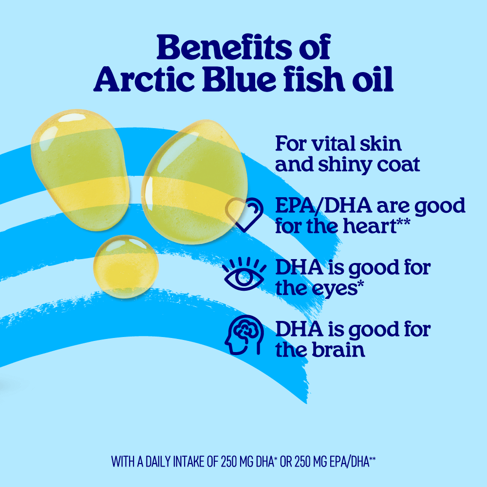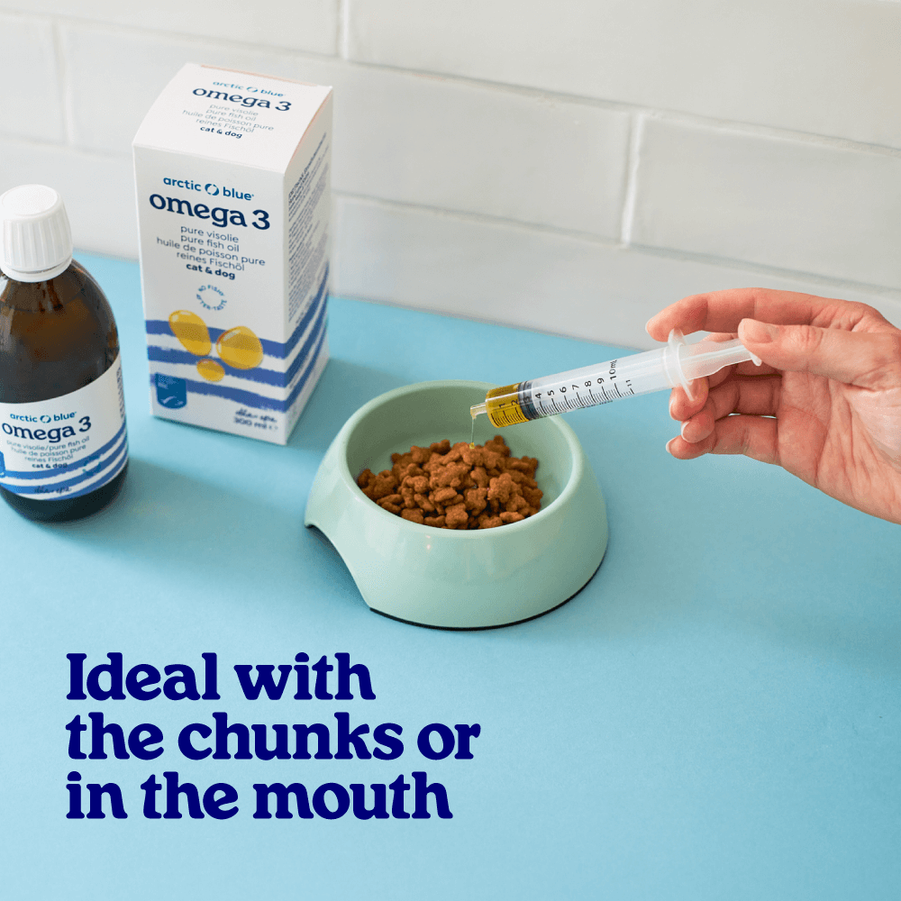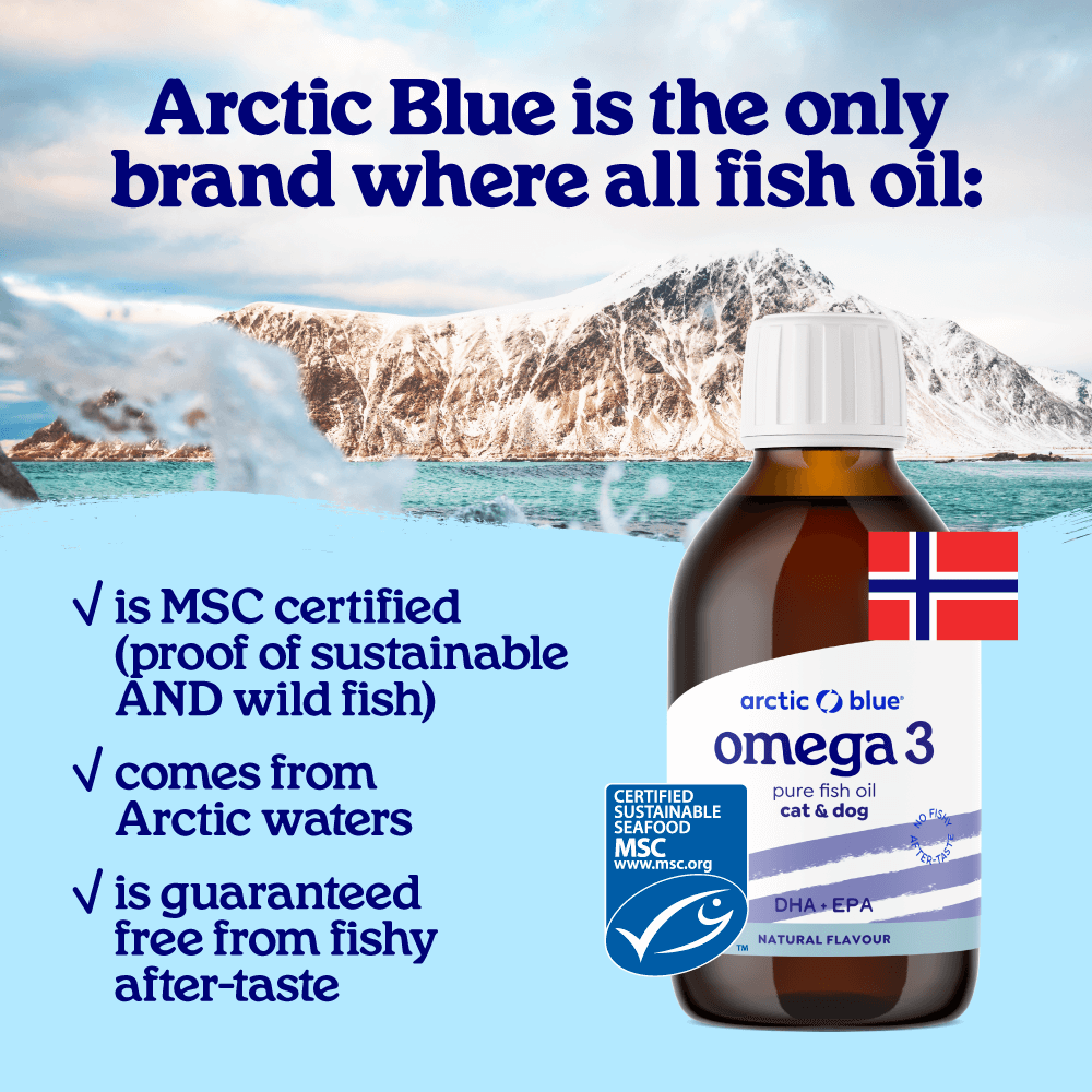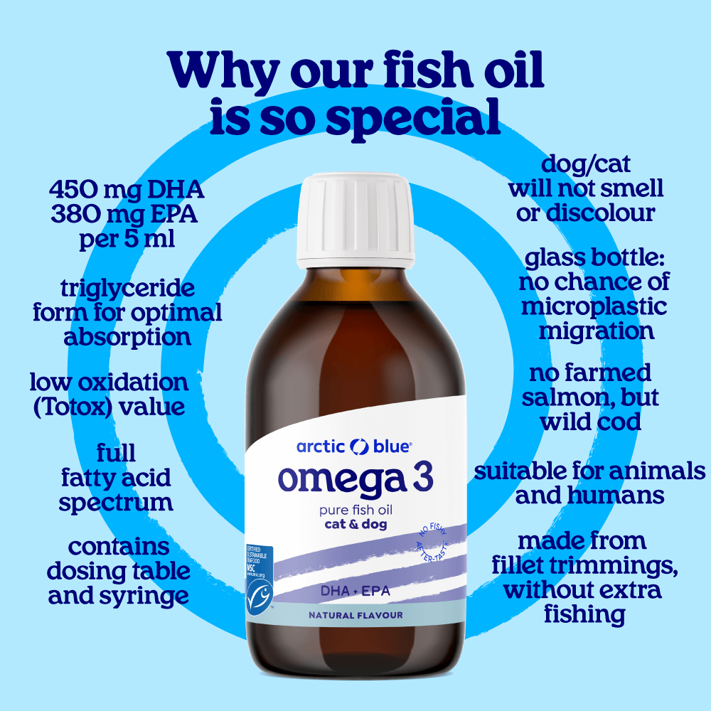 Pure Arctic MSC Fish Oil is a good omega-3 food supplement for dogs, cats and horses. It has a high dosage of EPA and DHA and is made from fresh Arctic wild fish. Liquid fish oil in bottle with syringe. Cheaper salmon oil, which is often given to pets and made from farmed salmon, contains about as much omega-3 as omega-6. We offer a better dosage that is hardly oxidized and contains much more omega-3 than omega-6.