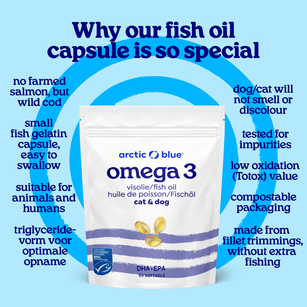 Pure Arctic MSC Fish Oil is a highly effective Omega-3 dietary supplement for dog, cat and horse. It has a high dose of EPA and DHA and is made from fresh Arctic wild fish. Liquid fish oil in a capsule. With this, we offer an alternative dosage, which is better (because hardly oxidized) than the common cheap salmon oil (made from farmed salmon), now given to dog, cat or horse.