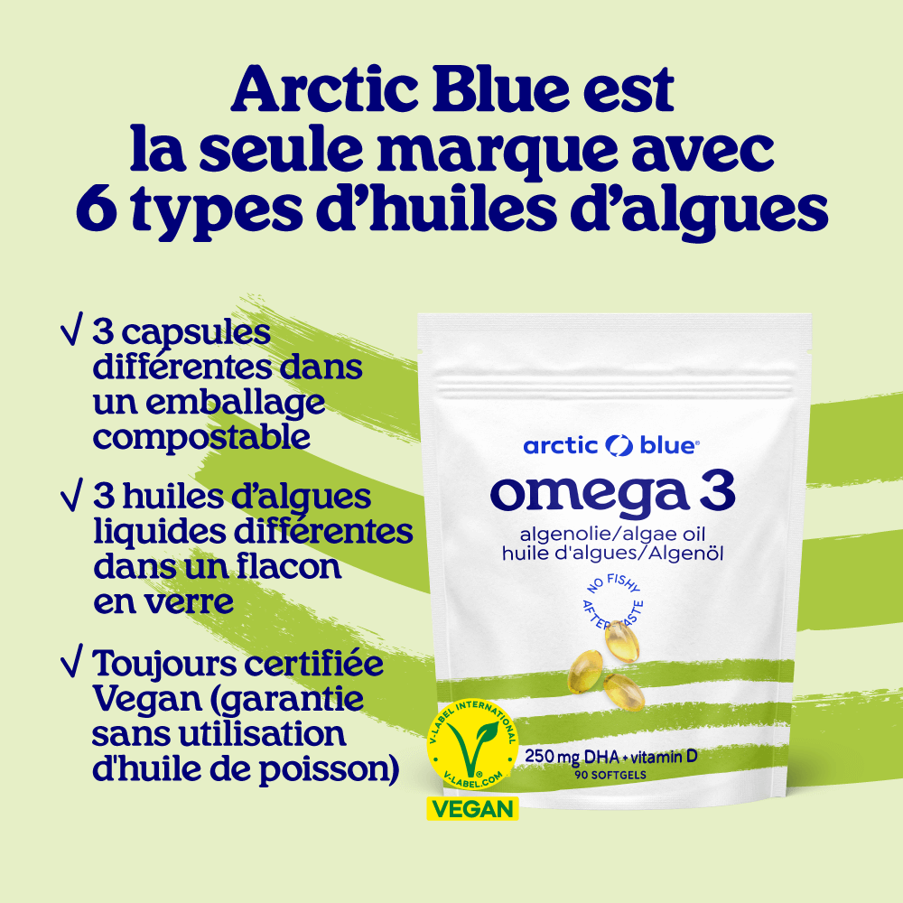 Supplément d'oméga-3 100 % végétal et donc végétalien.