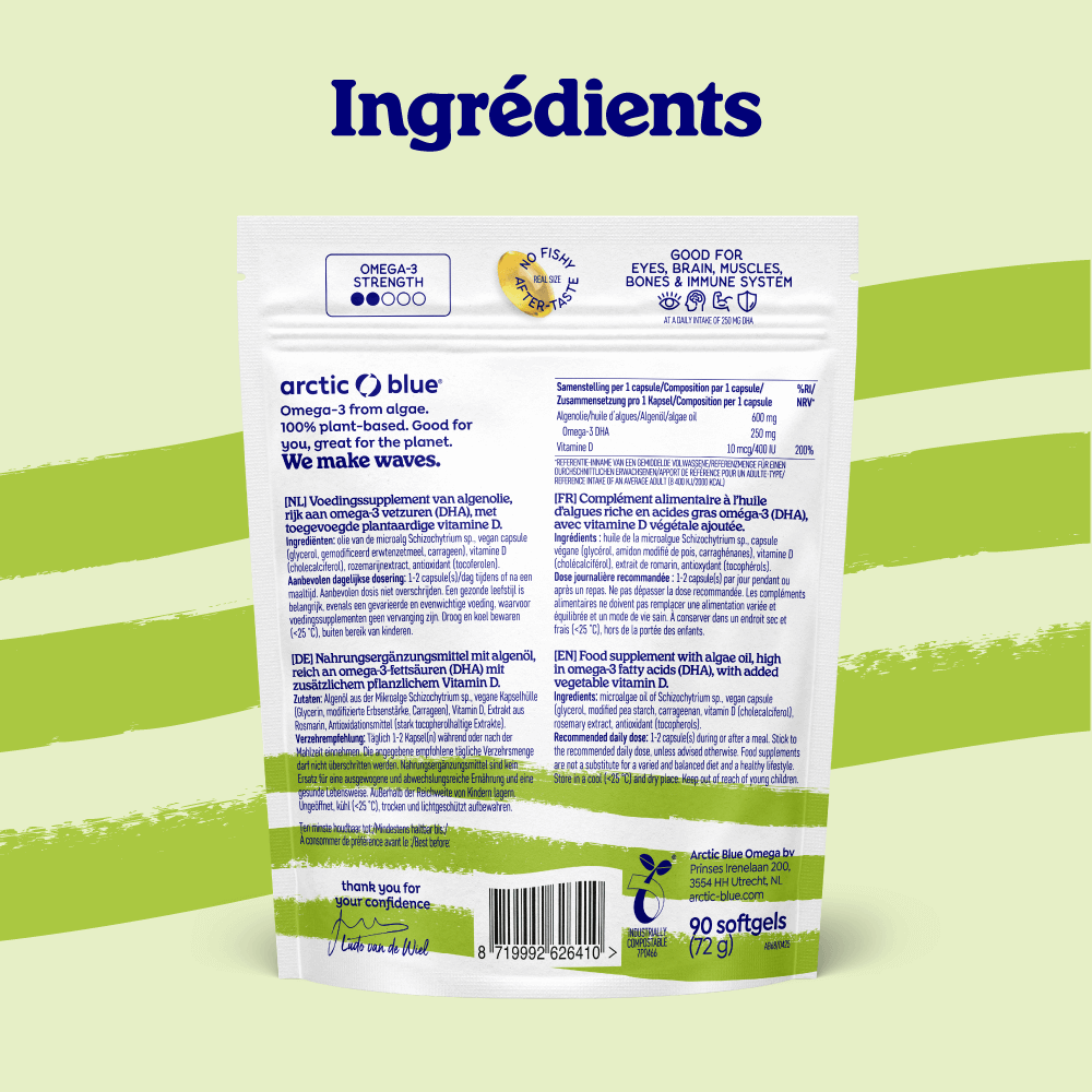 Schizochytrium sp. Algenolie, glycerol, gemodificeerd zetmeel, carrageen, hoog oliezuur zonnebloemolie, plantaardige vitamine D3 (cholecalciferol), natuurlijk rozemarijn extract, antioxidant (natuurlijke tocoferolen, ascorbylpalmitaat), zuurteregelaar (dinatriumfosfaat). Plantaardige algenolie wordt gemaakt van gekweekte microalgen in een gesloten systeem zonder milieu invloeden van buitenaf. Zo’n fermentatieproces lijkt op hoe yoghurt (m.b.v. bacteriën) en bier (m.b.v. gisten) in een fermentor wordt gemaakt De olie wordt uit de algenmassa geperst en er wordt natuurlijk antioxidant toegevoegd om de gevoelige Omega-3 vetzuren te beschermen. Een kleine beetje zonnebloemolie dient om de hoeveelheid Omega-3 DHA constant te houden. De plantaardige vitamine D3 wordt aan de algenolie toegevoegd voordat de capsules worden gemaakt met behulp van zeewier extract (carrageen). Het vitamine E houdende natuurlijke antioxidant beschermt de gevoelige Omega-3 vetzuren. Plantaardige tocoferolen (o.a. alfatocoferol) is vitamine E en beschermt als antioxidant de gevoelige Omega-3 vetzuren. <1 mg per capsule. Ascorbylpalmitaat is de vetoplosbare vorm van vitamine C en beschermt (net als rozemarijn extract) als antioxidant ook de gevoelige Omega-3 vetzuren. < 1 mg per capsule. Schizochytrium sp. is de naam van de algensoort. We zijn wettelijk verplicht deze te vermelden. Glycerol is een verdikkingsmiddel die samen met zetmeel (zie veelgestelde vragen) en carrageen het capsuleomhulsel vormt. Tezamen 25% van de hele capsule. Dinatriumfosfaat is in voeding een standaard zuurteregelaar die in minuscule hoeveelheid (<3 mg) mede zorgt voor stevigheid van de capsule. De capsule is vrij van kunstmatige aroma’s en vrij van conserveringsmiddelen, kleur- of zoetstoffen.