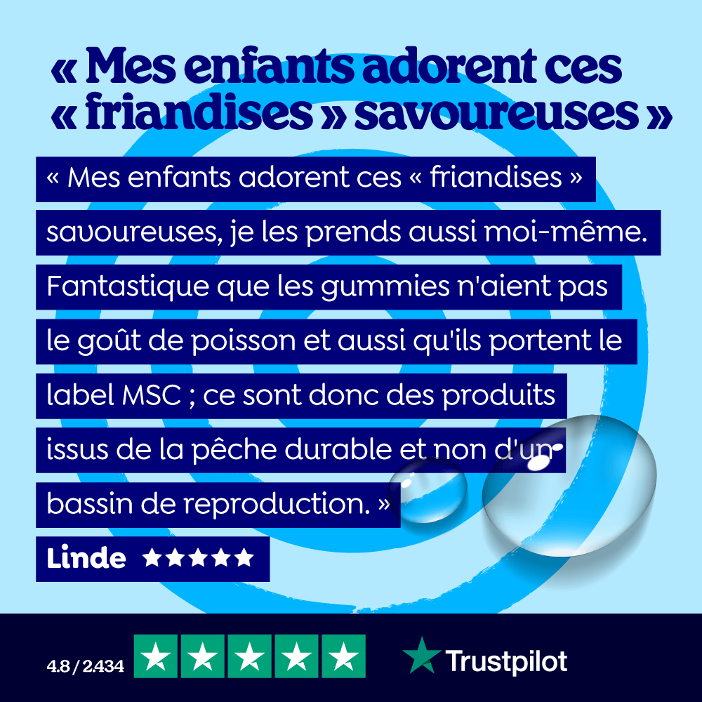 Huile de poisson certifiée MSC, eau, édulcorant (xylitol, érythritol), gélifiant (gélatine de poisson), régulateur d'acidité (citrate trisodique, acide malique), épaississant (gomme arabique), arômes naturels d'agrumes et de fraises, antioxydant (acide ascorbique), édulcorant (glycosides de stéviol), colorant (extrait de paprika), vitamine D (cholécalciférol), antimoussant (triglycérides).
