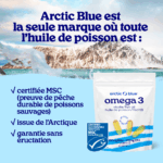 Les capsules d'huile de poisson Pure Alaska sont fabriquées à partir de colin d'Alaska provenant du golfe d'Alaska et de la mer de Béring. Il s'agit de la partie la plus septentrionale de l'océan Pacifique, qui borde le pôle Nord. Le filet de colin de l'Alaska est vendu au supermarché et l'huile de poisson est fabriquée à partir des parures de filet. Aucun poisson supplémentaire n'est donc pêché pour ce processus efficace. Arctic Blue a ainsi obtenu le label de qualité le plus strict pour l'huile de poisson : le label bleu MSC. Dans une installation moderne aux États-Unis, l'huile est purifiée et concentrée et on s'assure que l'huile de poisson conserve sa fraîcheur (= faible valeur Totox). En effet, la fraîcheur est une mesure de l'état des acides gras oméga-3 sensibles. L'huile de poisson fraîche ne rote donc jamais et ne donne jamais d'arrière-goût. Les capsules d'huile de poisson Arctic Blue conviennent donc également aux femmes enceintes et à celles qui allaitent.