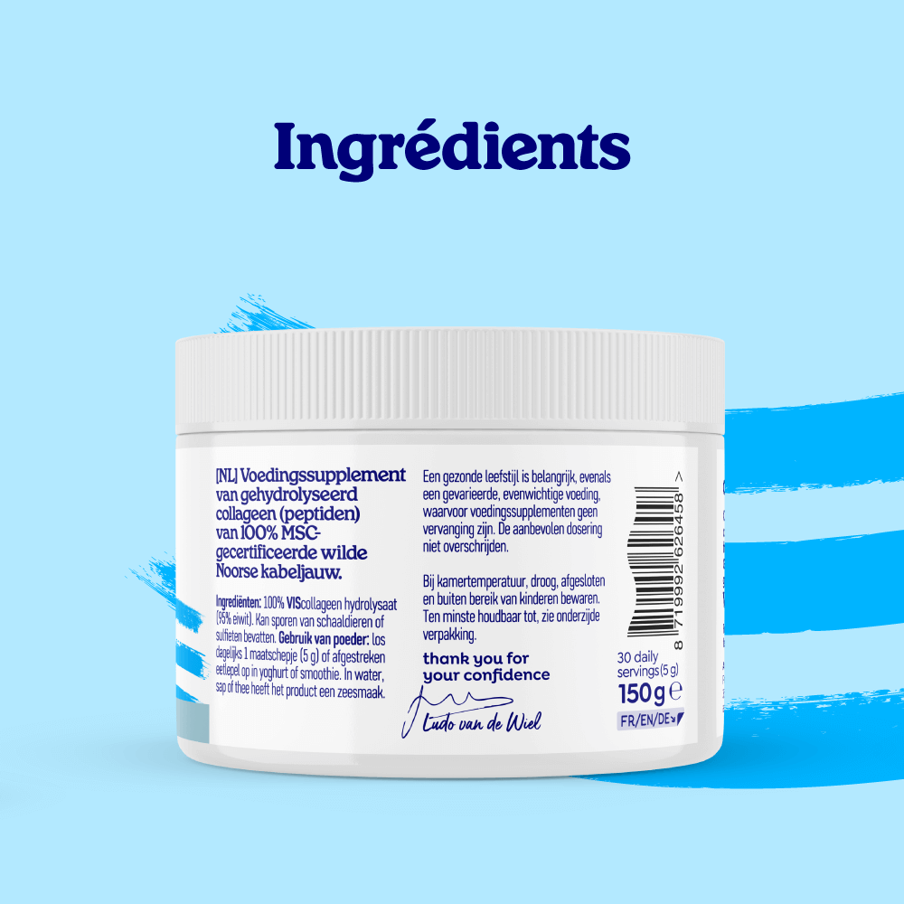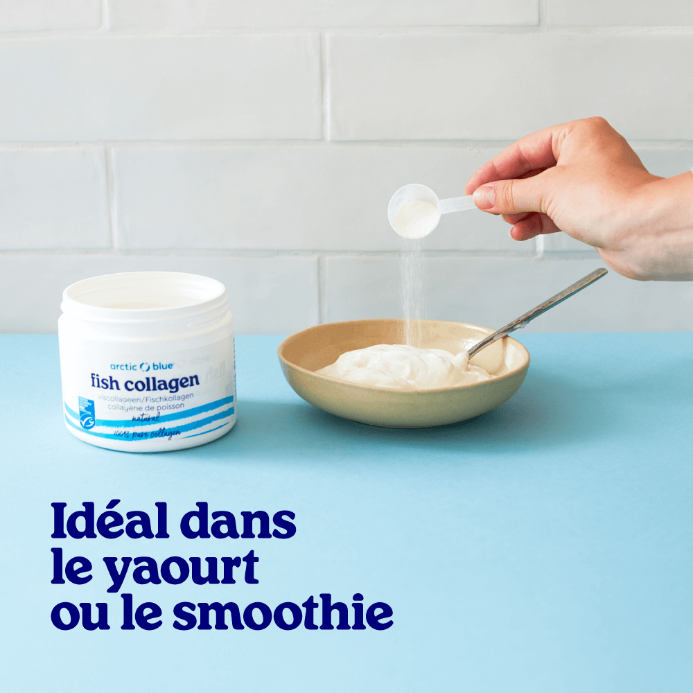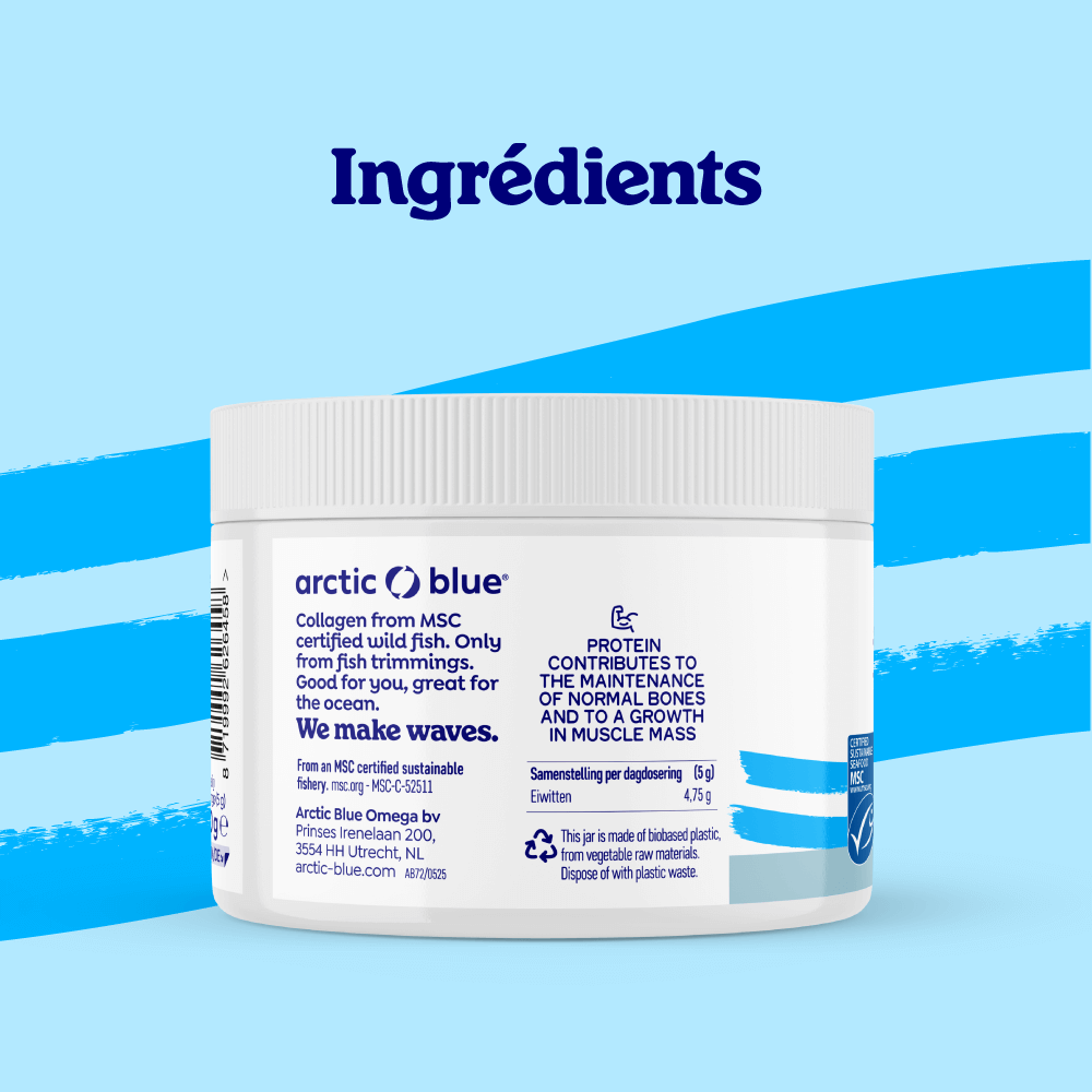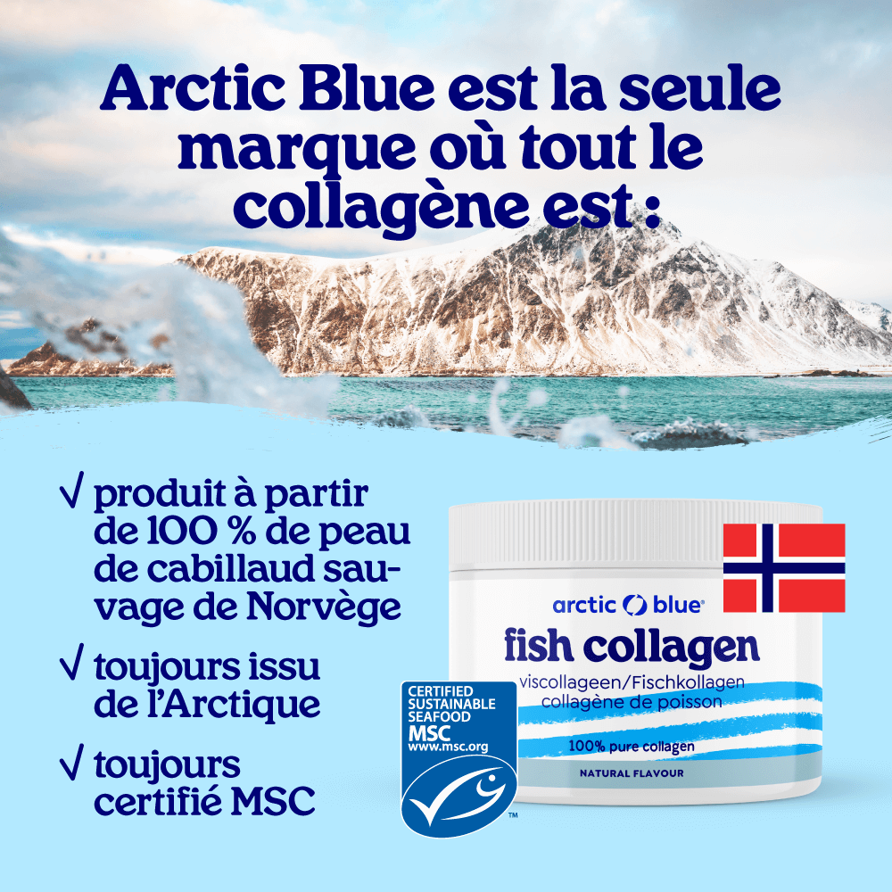 L'hydrolysat de collagène signifie que le collagène de poisson a été coupé (hydrolysé) en plus petits morceaux de protéines appelés peptides. Chaque supplément de collagène (poudre ou gélules) est un hydrolysat. Dans notre corps, nous découpons les peptides en acides aminés individuels qui sont absorbés dans le sang. La raison pour laquelle Arctic Blue choisit le collagène de poisson est qu'il est le plus similaire au collagène humain, ce qui est expliqué ici. De plus, Arctic Blue est la seule marque dont la poudre de collagène porte un sceau d'approbation, ce qui prouve qu'elle provient de poissons sauvages (et non, par exemple, de tilapias ou de vaches d'élevage).