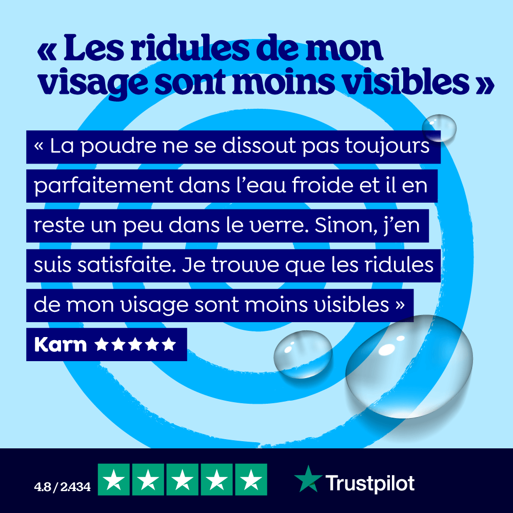 La formation des rides est liée à de nombreux facteurs. Il est bien connu que le collagène est responsable de la fermeté et de l'élasticité de la peau. C'est un fait que lorsque tu vieillis un peu, le collagène se dégrade. Le collagène de type I se trouve dans : la peau, les os, le cartilage, les tissus conjonctifs, les ligaments, les tendons, les vaisseaux sanguins, les cheveux et les ongles. Il est composé d'environ 20 acides aminés différents. Plus de la moitié d'entre eux sont des acides aminés essentiels ou semi-essentiels. Essentiel signifie que nous ne pouvons pas les fabriquer nous-mêmes, mais que nous devons les obtenir par notre alimentation. Ainsi, en fonction de ton régime alimentaire, la prise de collagène de poisson supplémentaire est utile.