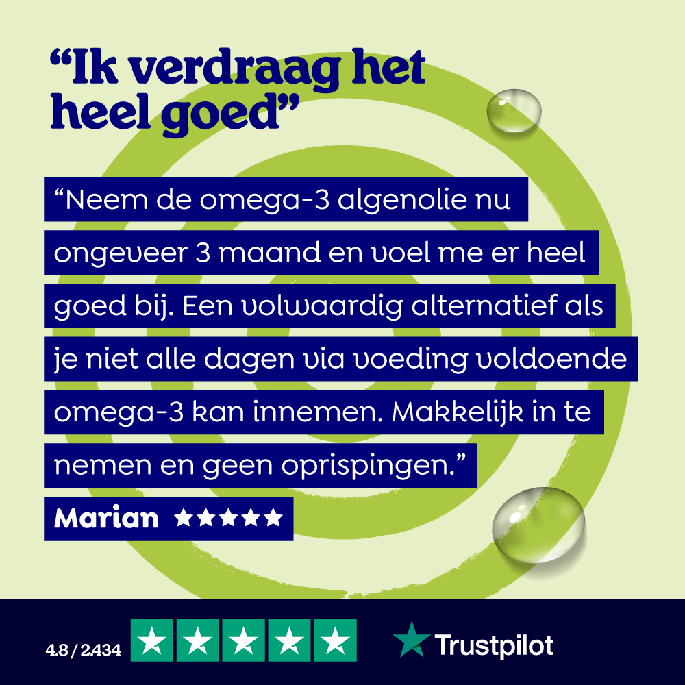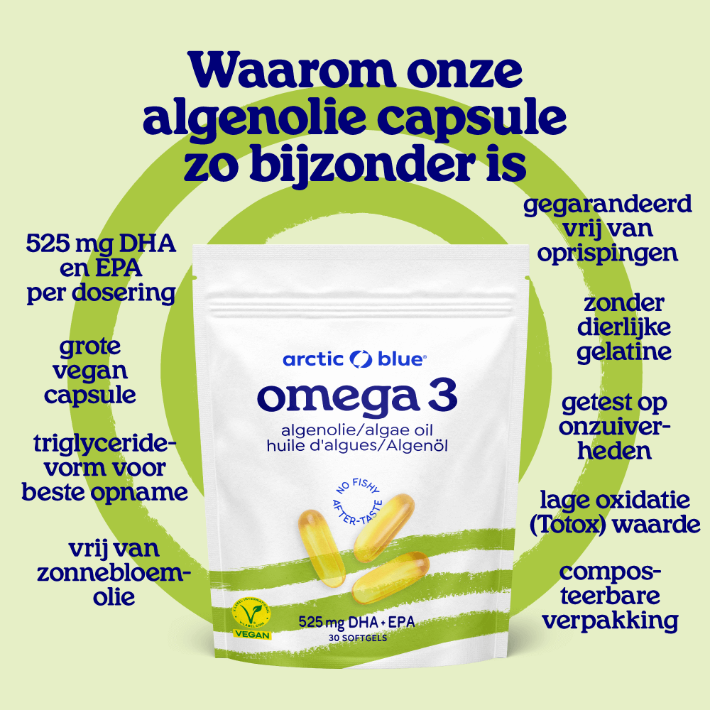 Algen zijn mini-plantjes die in water zelf Omega-3 vetzuren kunnen maken. Algen geven deze in de natuur door aan ‘vette’ vissen zoals haring en sardien, als ze gegeten worden. Hierdoor heeft algenolie de kracht van visolie. Omdat we algenolie capsules maken van gekweekte algen in een gecontroleerde omgeving, weten we ook zeker dat er geen verontreinigingen uit de ocean in kunnen zitten. Het capsuleomhulsel is ook plantaardig omdat de gelatine is vervangen door o.a. zeewier.