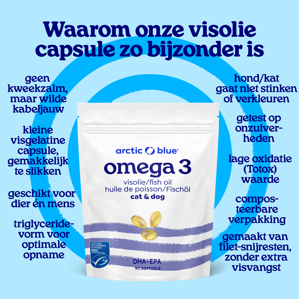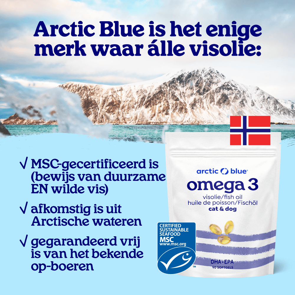 Pure Arctische MSC Visolie is voor hond, kat en paard een zeer effectief Omega-3 voedingssupplement. Het heeft een hoge dosering EPA en DHA en is gemaakt van verse Arctische wilde vis. Vloeibare visolie in een capsule. We bieden hiermee een alternatieve dosering aan, die beter is (want nauwelijks geoxideerd) dan de gangbare goedkope zalmolie (gemaakt van gekweekte zalm), die nu aan hond, kat of paard gegeven wordt.