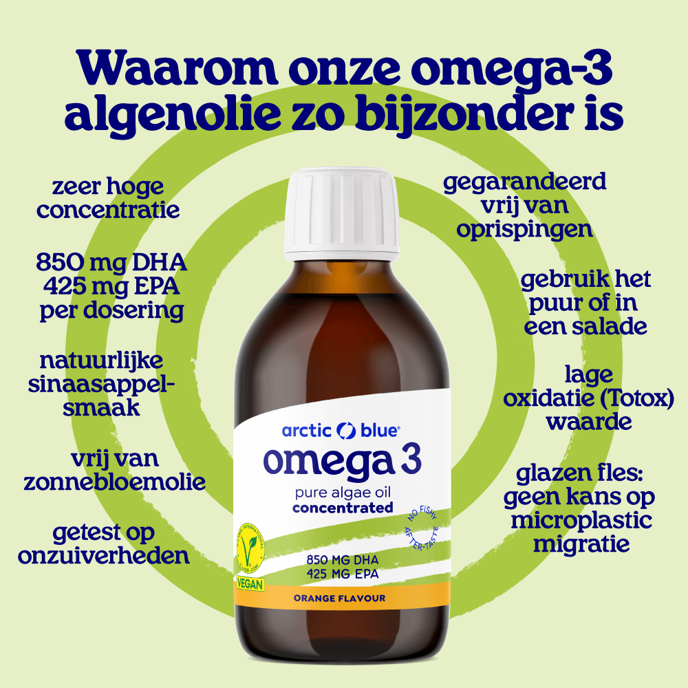 Olie gemaakt van algen, is de enige olie op aarde die dezelfde Omega-3 vetzuren EPA en DHA bevat als visolie. Dat is niet zo gek als je bedenkt dat vette vissoorten afhankelijk zijn van het eten van algen of het eten van kleine visjes die algen hebben gegeten. De smaak van de olie leent zich voor gebruik in bijv. yoghurt, maar ook zo van de lepel. Geen kans op vissmaak of oprispingen.